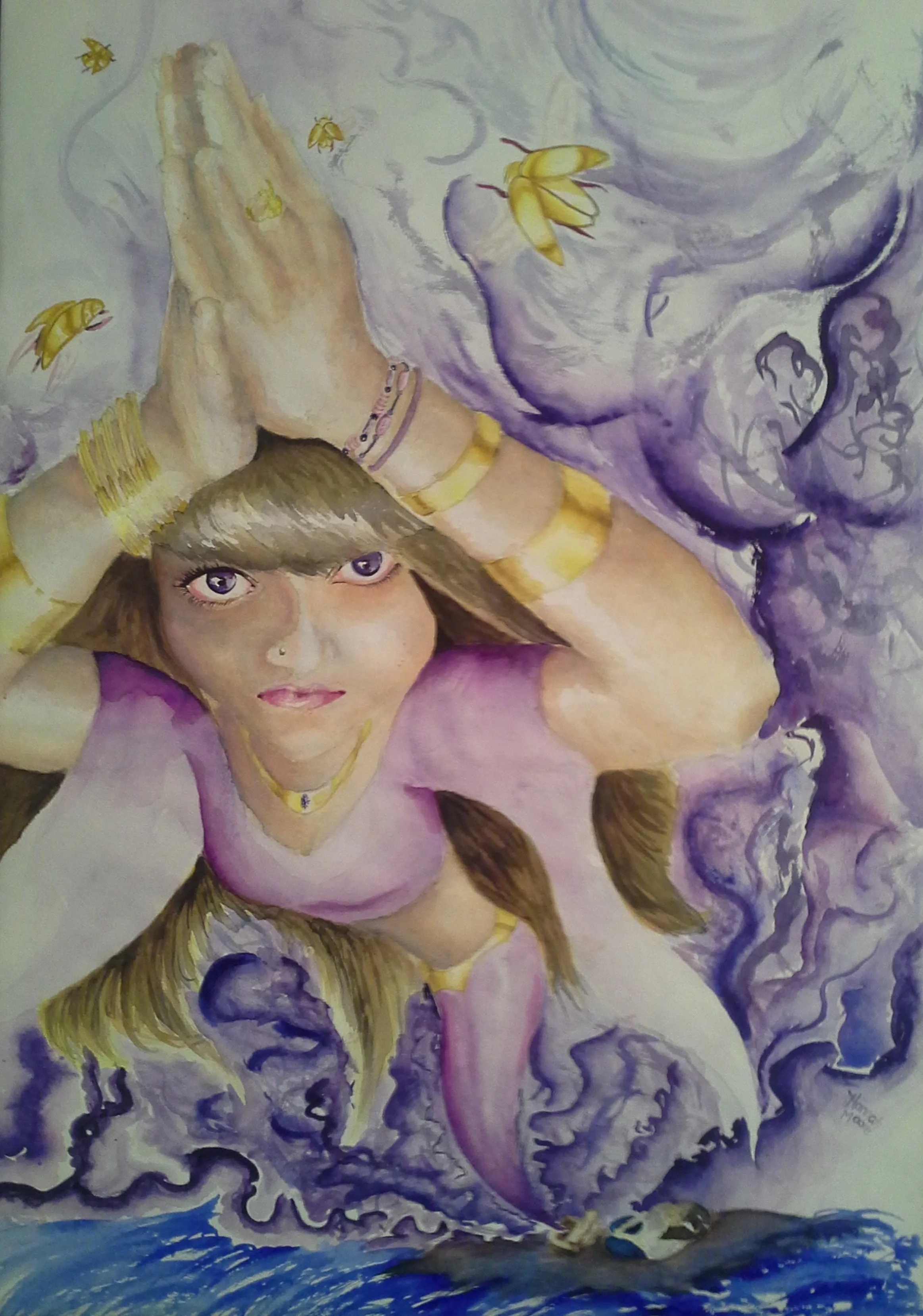 My 2nd ever traditional watercolor portrait painting. This piece was meant to speak to a childhood friend. She had lost her adoptive brother and adoptive father while she was away from home. When she thought of her losses, she would listen to a song with the memorable line: “I could really use a wish right now.” This piece was me trying to provide her a genie. The various cultures represented through different aspects of this painting were symbolic of the fact that she didn’t know what her cultural background was because she had been adopted at a young age.