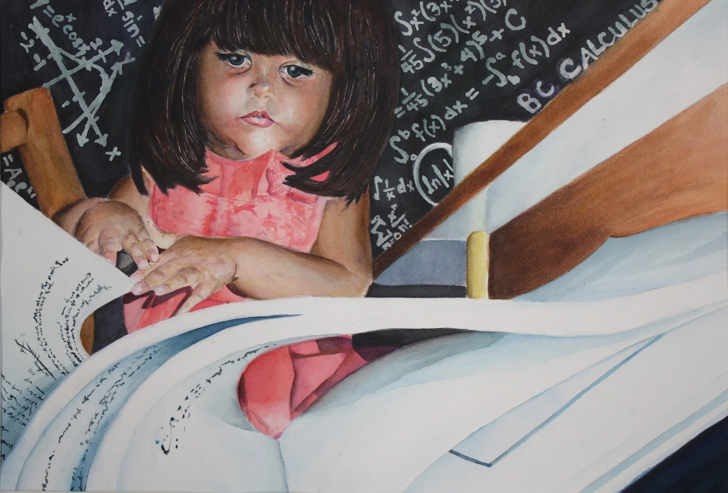 A prodigy child, just brushing up on her calculus after taking a sip from her cup of coffee with her adorable baby hands. My 3rd ever traditional watercolor portrait painting. This is the painting that solidified my love for watercolor.