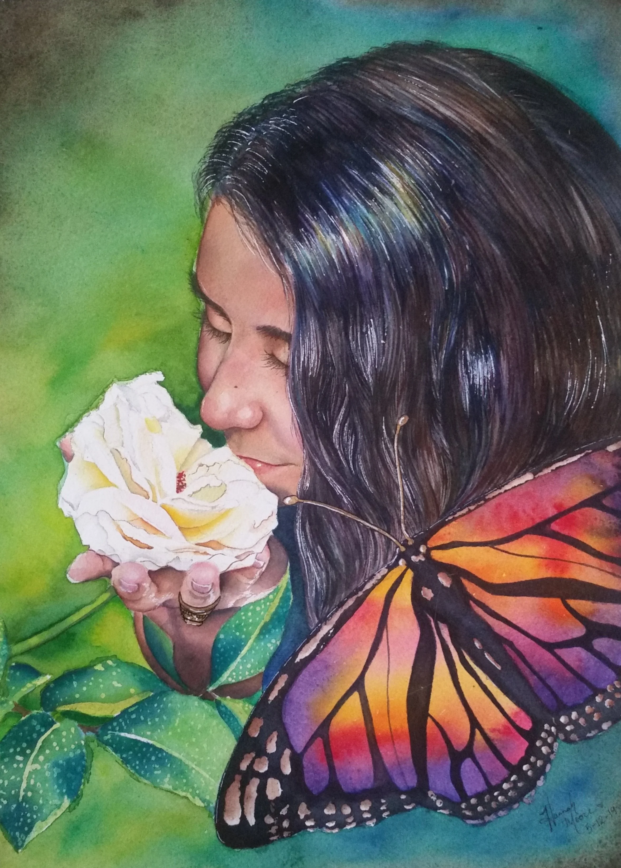Traditional water color painting of a beautiful young woman smelling a white rose. This was created as a gift to a close friend who drove many hours to visit me when I was feeling lonely. We went to a local botanical garden and visited a butterfly nursery. Scroll down to view process photos.