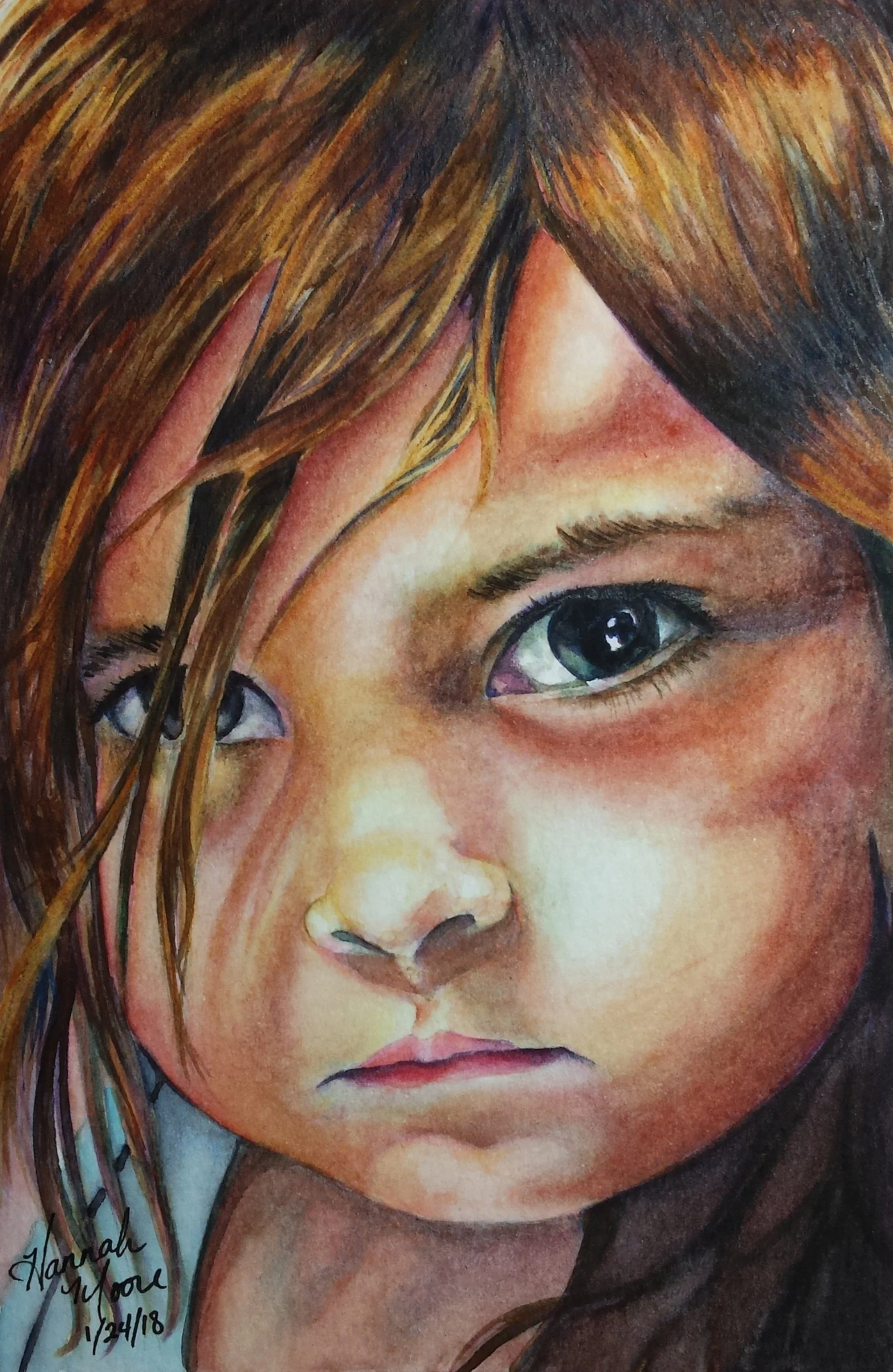 Pokey Traditional watercolor painting of an intelligent, shy child and her gorgeous, serious stare. Scroll down to view process photos. Painting Process
